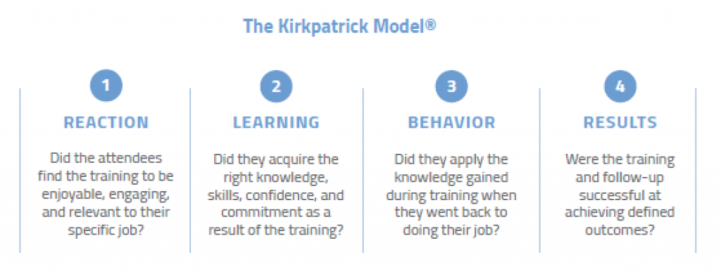 Many managers apply the well-known Kirkpatrick Model to measure training effectiveness. It consists of four levels.